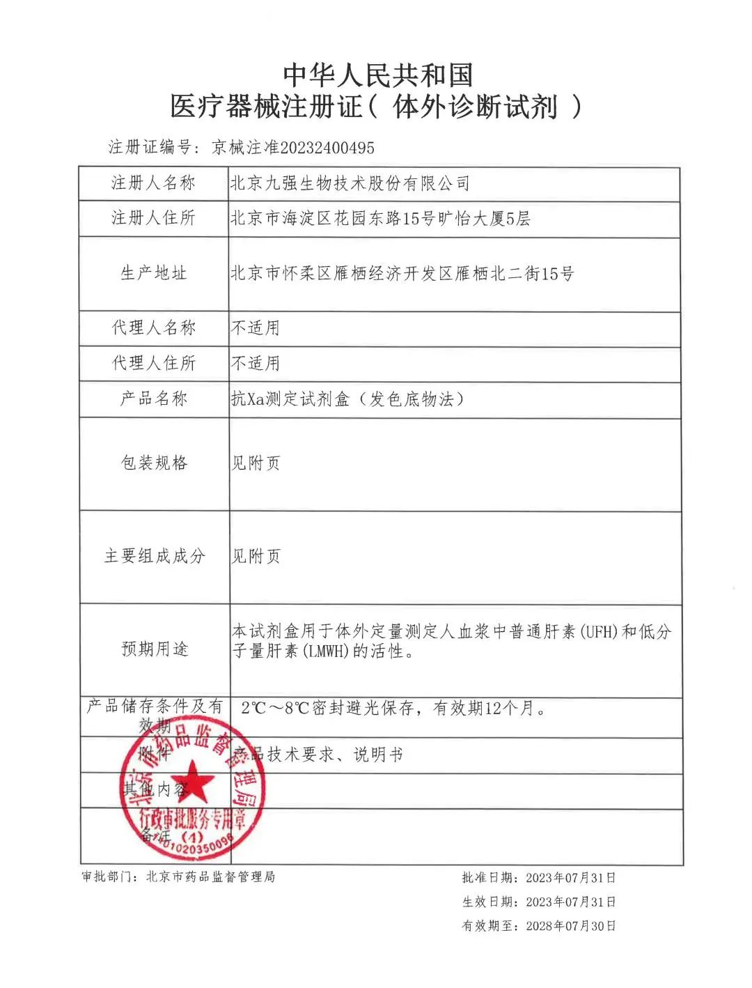 九強(qiáng)生物抗Xa(發(fā)色底物法)順利取得北京市藥品監(jiān)督管理局頒發(fā)的《醫(yī)療器械注冊證》。